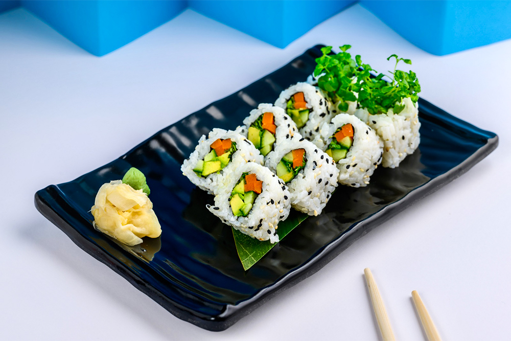 An 8-piece roll of carrots, cucumber, avocado, kawaire sprouts, and rolled together create a delicious, healthy roll.