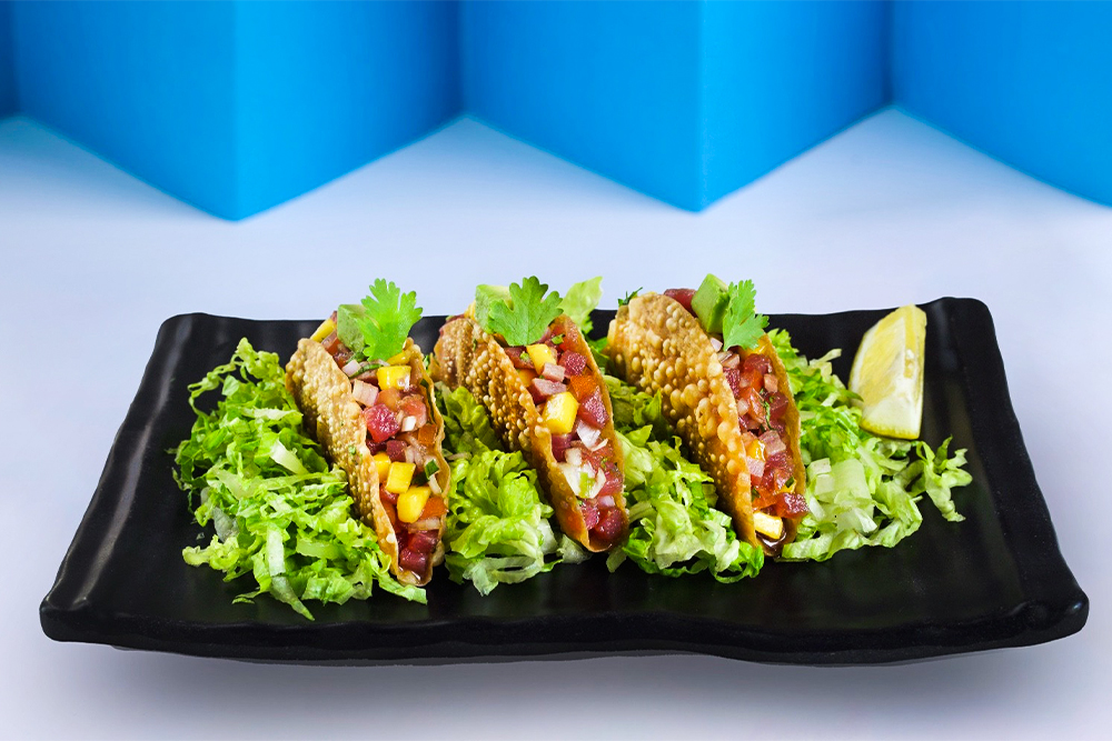 Crispy homemade tacos with savory filling of your choice. Mixed with flavorful and tangy mango salsa, creamy avocado, cilantro, and lettuce slaw.